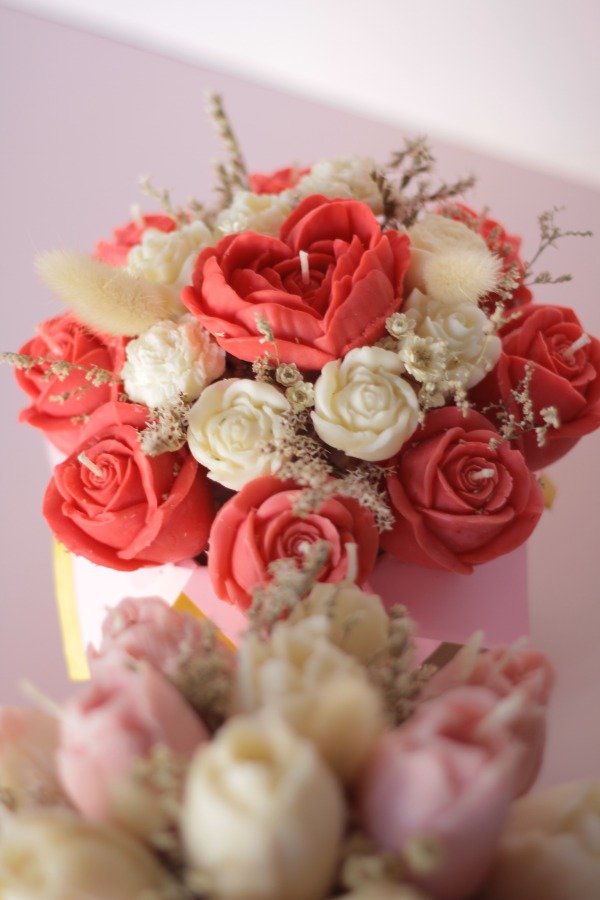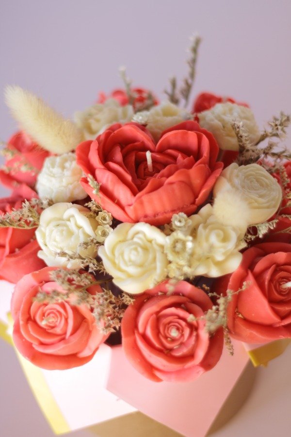 Nuestro bouquet de rosas está compuesto por velas moldeadas una por una, con una terminación que imita la textura y forma real de una rosa abierta.