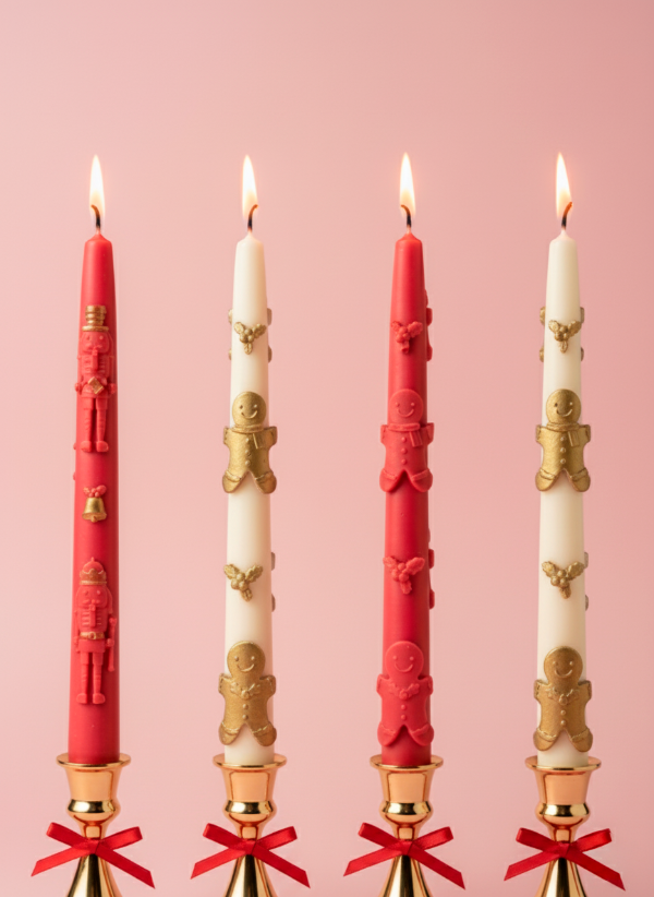 Porque la Navidad también se celebra a la luz de las velas ✨. Estas velas altas tipo dinner vienen con relieves naturales o dorados de los clásicos de la temporada: cascanueces, campanitas y muerdagos 🌟.