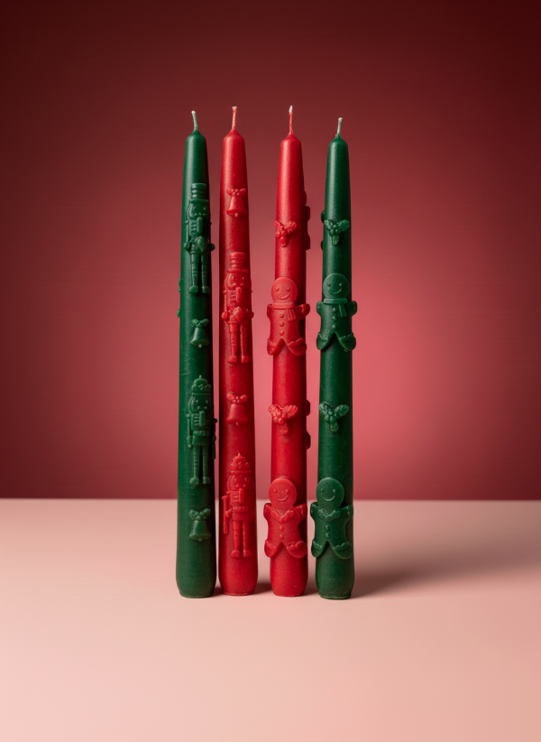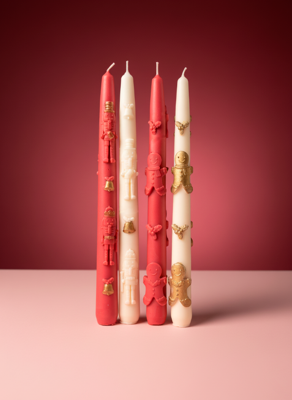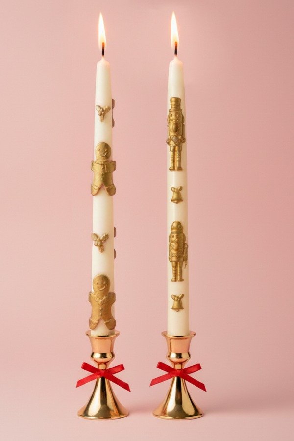Porque la Navidad también se celebra a la luz de las velas ✨. Estas velas altas tipo dinner vienen con relieves naturales o dorados de los clásicos de la temporada: muñequitos de jengibre y muerdaguitos con campanas🌟.