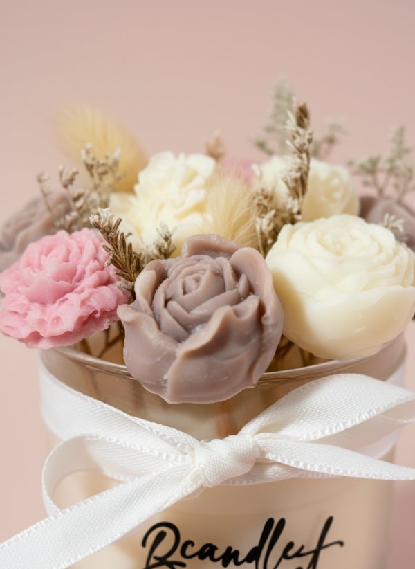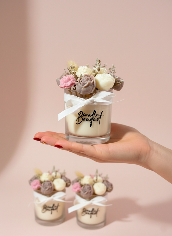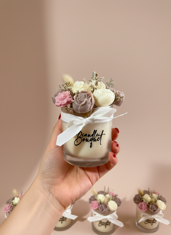 Nuestra Candle Bouquet está hecha a mano con cera vegetal premium y decorada con mini flores en cera, moldeadas una a una.